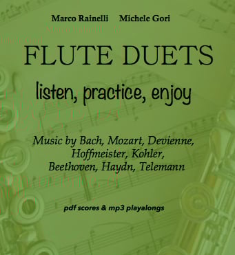 "Flute Duets" includes 8 duets for flute (PDF sheets) by composer like Bach, Mozart, Beethoven, etc. Each duet is provided with three mp3 playalongs: the complete recording and two separate tracks of 1st and 2nd flute, that will allow you to play duets with a real flute accompaniment!